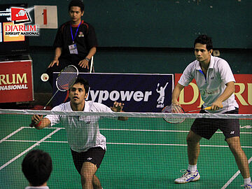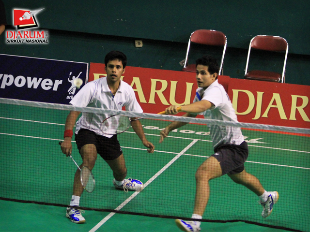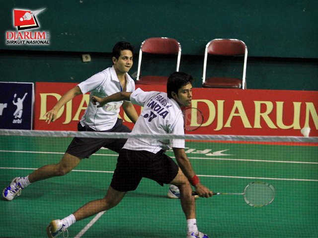 Pemain India, Francis ALwyn/Sanyal Jishnu berusaha mengembalikan kok ke arah pemain PB Djarum, Fernando Kurniawan/Wifqi Windarto dalam babak perempat final Ganda Dewasa Putra Djarum Sirkuit Nasional Surabaya di GOR Sudirman, Surabaya, Jum`at (4/11).