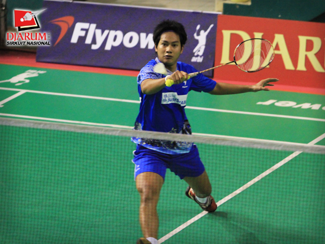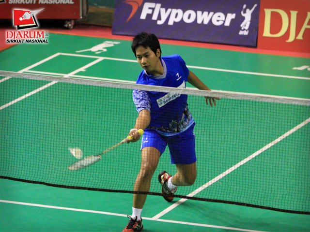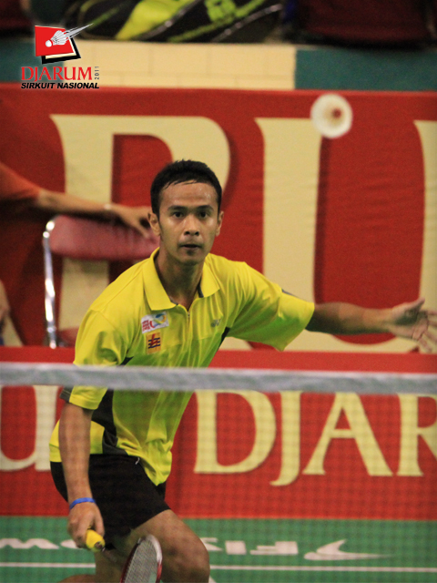Pemain SGS PLN Bandung, Senatria Agus Setia Putra mengembalikan kok ke arah pemain Jaya Raya Suryanaga, Fauzi Adnan dalam babak Semifinal dewasa putra Djarum Sirkuit Nasional Surabaya di GOR Sudirman, SBY, Jum`at (4/11).