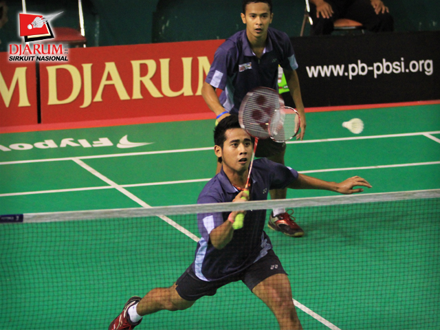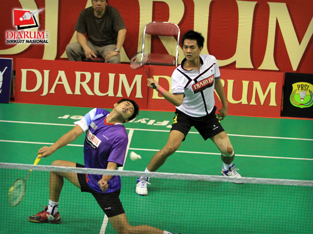 Pemain Pusdiklat Jaya Raya/SGS PLN Bandung, Hermansyah/Senatria berusaha mengembalikan kok ke arah pemain Mutiara Bandung, Hardianto/Ivandi Danang dalam babak perempat final Ganda Dewasa Putra.