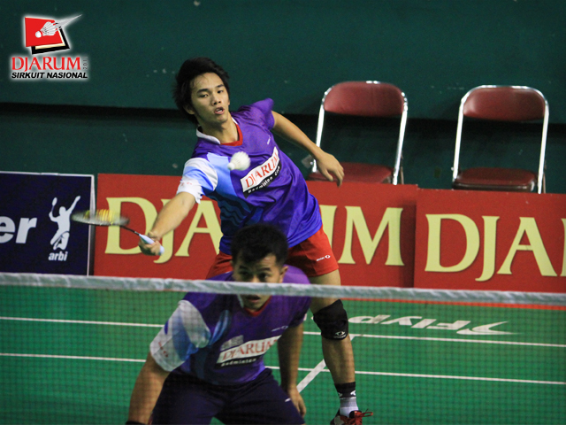Pemain PB Djarum, Albert Saputra/Rizki Yanu Kresnayandi berusaha mengembalikan kok ke arah pemain Pelatnas, Alrie Gunadharma/Panji Akbar Sudrajat dalam babak perempat final Ganda Dewasa Putra Djarum Sirkuit Nasional Surabaya di GOR Sudirman, Surabaya.
