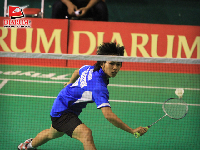 Pemain SGS PLN Bandung, Mutiarani berusaha mengembalikan kok ke arah pemain Pelatprov DKI Jakarta, Ganis Nurrahmadani dalam babak semifinal Tunggal Dewasa Putri Djarum Sirkuit Nasional Surabaya di GOR Sudirman, Surabaya, Jum`at (4/11).