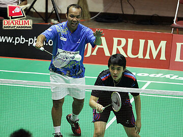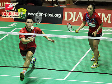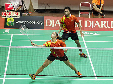 Pasangan I Putu Roy/Berliyan Sudrajat (Gemilang Surabaya/Semen Gersik) berusaha mengembalikan bola ke arah pasangan Ricky Alverino/Febriani Endar (PB Djarum Kudus).