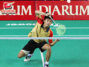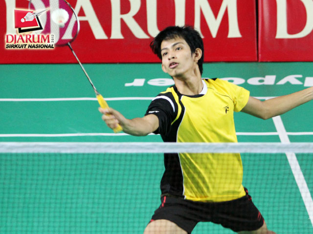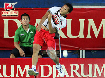 Muhammad Syahrir (Terengganu) sedang memukul kok untuk dikembalikan kepada Ari Januari (Tangkas Specs).