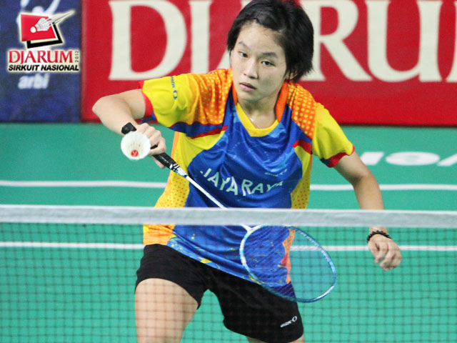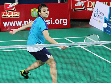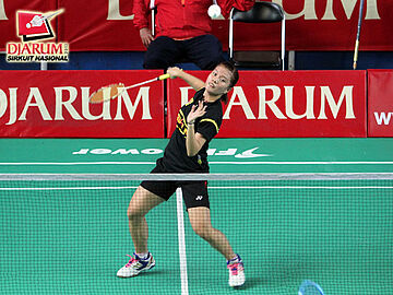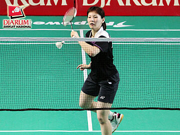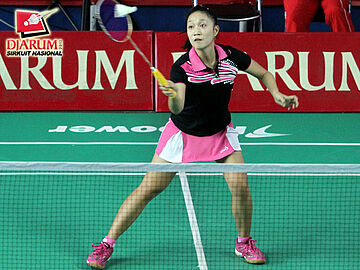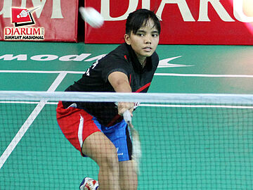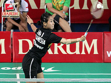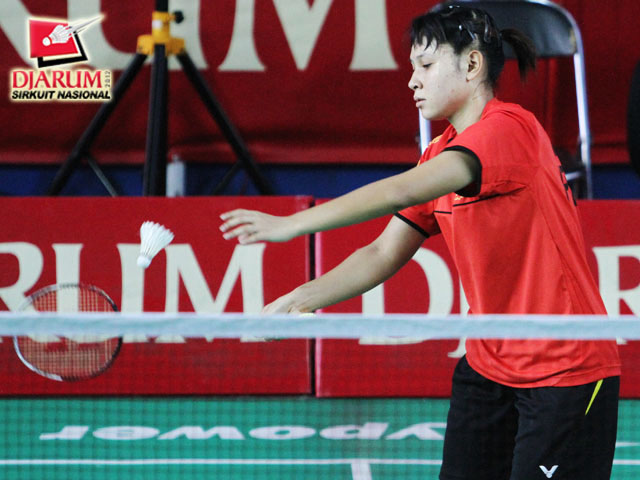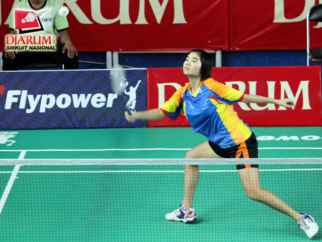 Arinda Sari Sinaga (Djarum Kudus) sedang mengembalikan kok kepada lawannya, Rina Andrian (Mutiara Bandung).