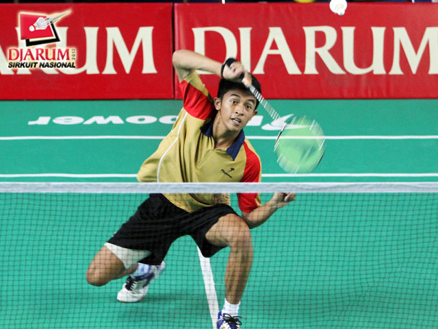 Ihsan Adam Wirawan (Guna Dharma) sedang mengembalikan kok pada saat bertanding melawan Kaesar Akbar (SGS PLN).