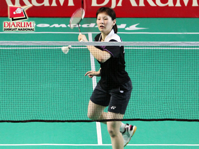 .Ruselli Hartawan (Pusdiklat Jaya Raya) dalam posisi siap untuk mengembalikan kok yang di serve oleh Elizabeth Matindas (SGS PLN).