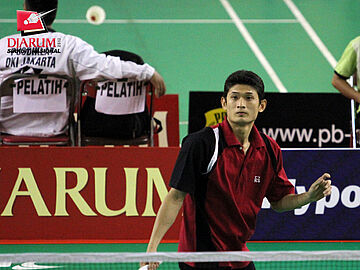 Pemain Pusdiklat Jaya Raya, Candra Wijaya, berusaha mengembalikan kok ke arah pemain Tangkas Alfamart, Wilson MR.