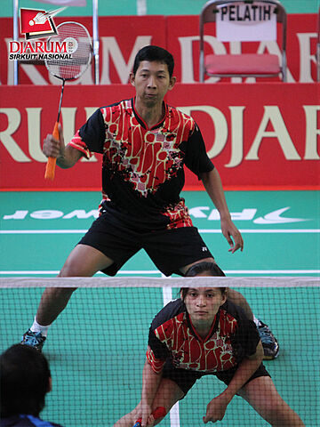 Flandy Limpele dan pasangannya asal SGS PLN Bandung, Natalia Poluakan berusaha mengembalikan kok ke arah pasangan asal Nurmansyah/Siti dari PB Pelabuhan.