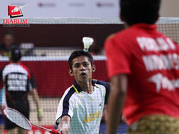 Ramadhani Zulkifli berusaha mengembalikan kok kepada kompatriotnya di PB Djarum, Joyireh Avi Manasye