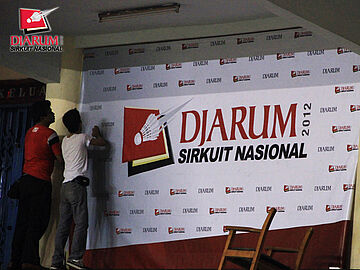 Dua orang panitia sedang memasang backdrop Djarum Sirkuit Nasional diI GOR Kota Baru dalam rangka persiapan menjelang Djarum Sirnas Jambi Open 2012.