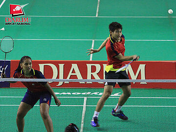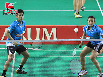 Pasangan Ganda Taruna Campuran asal Mutiara Bandung, Mareta Dea Giovani (depan) yang berpasangan dengan Bagus Haryanto (belakang) sedang bersiap-siap memukul kok.
