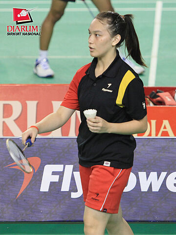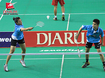 Aneke Putri yang berpasangan dengan Setyaldi Putra Wibowo asal Guna Dharma akan melakukan serve dalam pertandingan melawan pasangan Yantoni Edy Saputra/Febriani Endar Kusumawati asal PB Djarum.