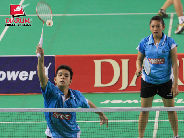 Bagus Haryanto (depan) yang berpasangan dengan Mareta Dea Giovani (belakang) saat akan memukul kok ke arah lawan.