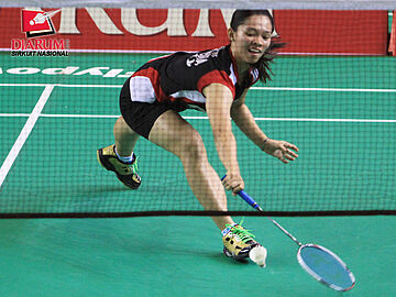 Pemain PB Djarum, Arinda Sari Sinaga sedang mengejar kok dari pemain SGS PLN Bandung, Dina Rahayu.