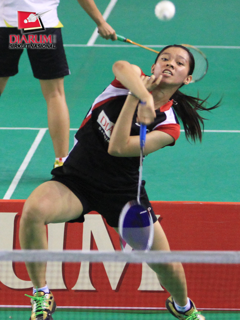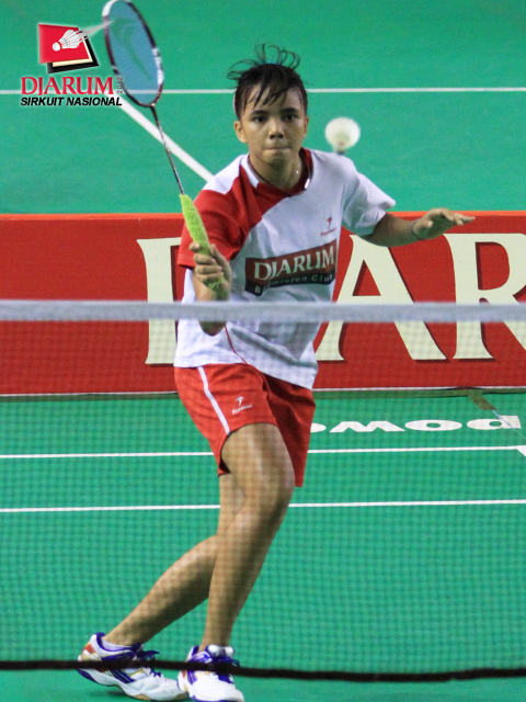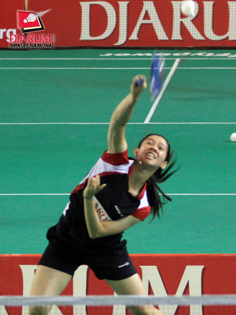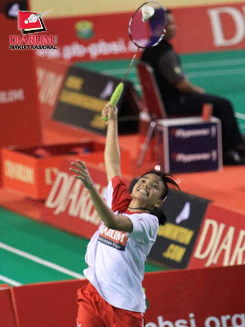 Pemain PB Djarum, Syafitri Nur Azizah sedang memukul kok saat bertanding melawan Ahsaniaty Putri dari Guna Dharma.