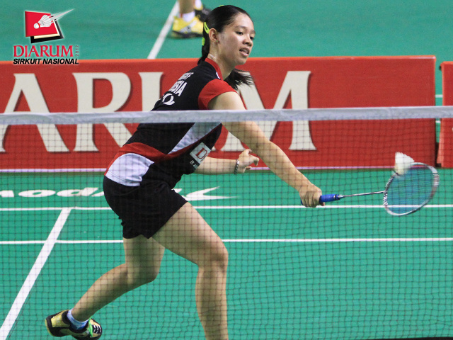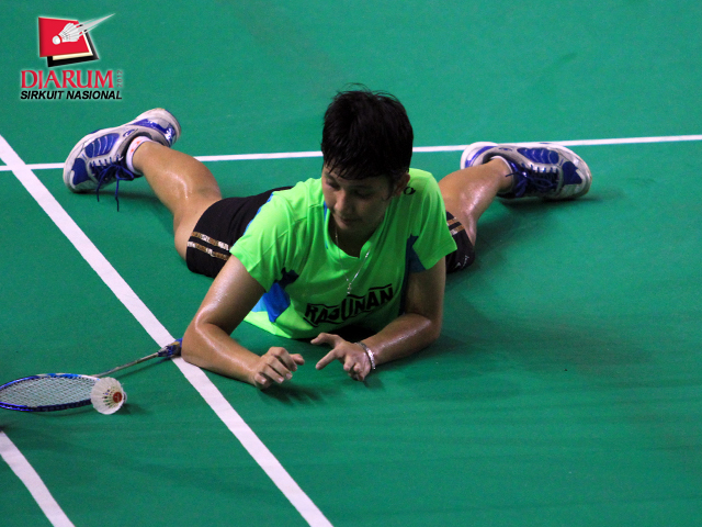 Ekspresi kepuasan Arinda Sari Sinaga dari PB Djarum ketika berhasil mencetak poin dalam pertandingan melawan Dina Rahayu dari SGS PLN Bandung. Arinda menang 21-10, 15-21, dan 21-8 atas Dina.