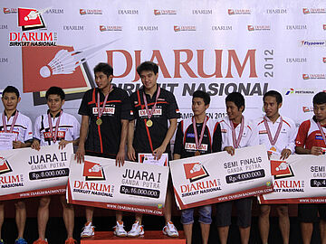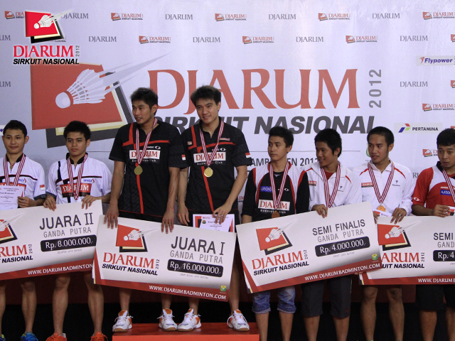Para juara Ganda Dewasa Putra Djarum Sirnas Jambi Open 2012 berfoto bersama usai pembagian hadiah.