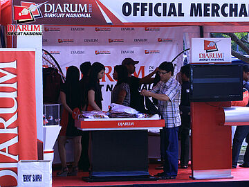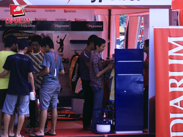 Aktivitas di booth official merchandise Djarum yang terdapat di depan Gelora Kota Baru pada saat final Djarum Sirnas Jambi Open 2012.