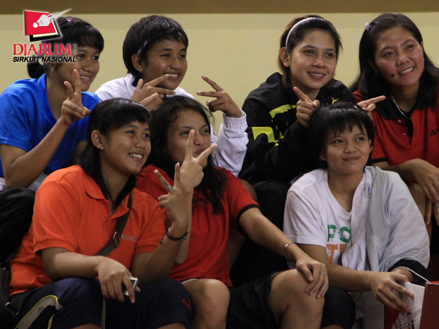 Pemain Pelatprov DKI, Ganis Nurrahmadini berfoto bersama teman-temannya di Gelora Kota Baru sebelum acara pembagian hadiah dimulai.