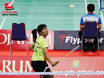 Wati (ICLI Gowata Sungguminasa) berusaha mengembalikan kok ke arah Pia Zebadiah (Pusdiklat Jaya Raya Jakarta).
