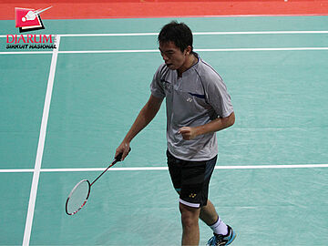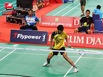 Jonathan Christie (Tangkas Alfamart Jakarta) berusaha mengembalikan kok ke arah Muh.Erwin (Arena Spirit Cirebon).