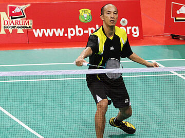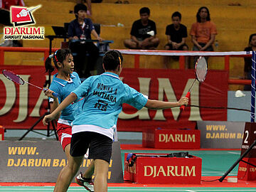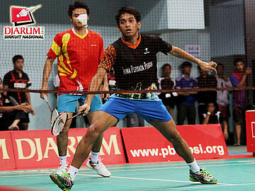 Pasangan Arsya Isnanu Ardi Putra/Hantoro (Djarum Kudus) berusaha mengembalikan kok ke arah pasangan R.E.F/Rian S (Pusdiklat Jaya Raya)