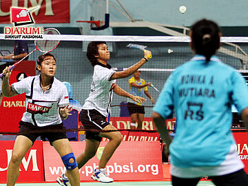 Pasangan Chintia Rhizta Andreti/Jessica Shoham (PB Djarum) berusaha mengembalikan kok ke arah pasangan Monica Angilu/Suci Ramadhani (Mutiara Bandung)
