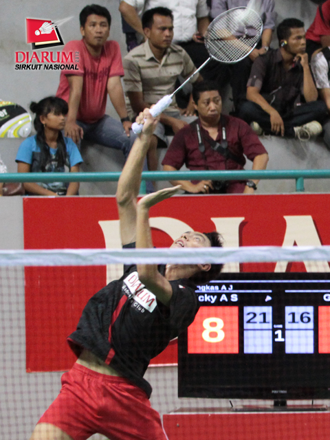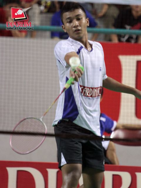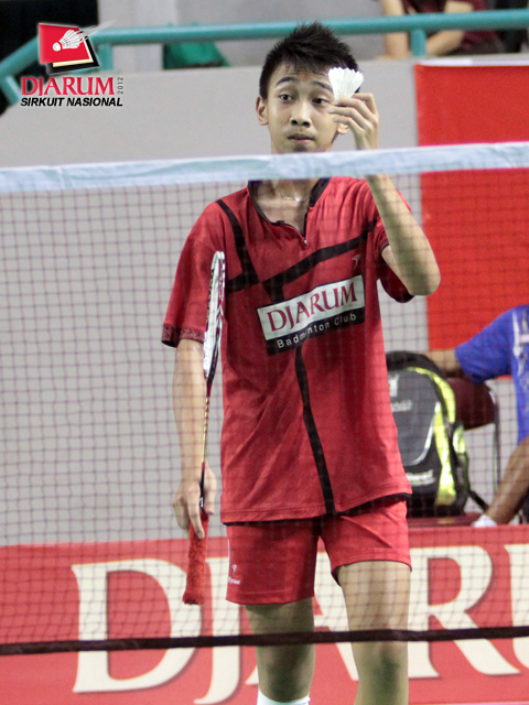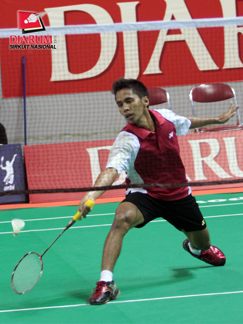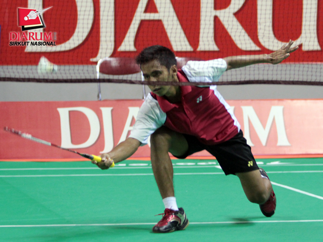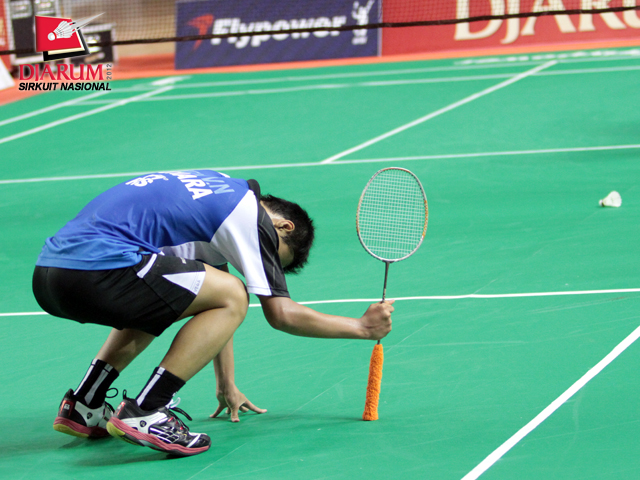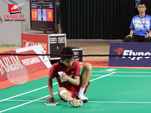 M. Revindra dari PB Djarum terpeleset saat bertanding melawan Vega Vio dari Mutiara Bandung. Dalam laga pertandingan yang berlangsung rubber set tersebut, Revindra berhasil menaklukkan Vega dengan skor akhir 21-12/20-22/21-13.