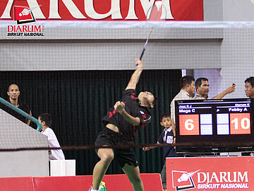 Mega Cahya, pemain asal Jaya Raya Jakarta sedang memperhatikan arah jatuhnya kok saat bertanding melawan Febby Angguni dari PB Djarum.