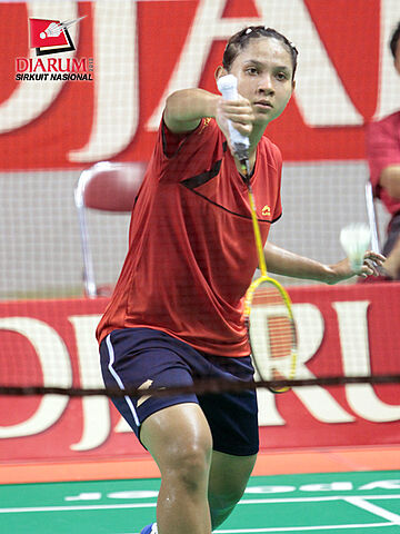 Pemain asal Pertamina Indonesia, Ganis Nurahmadini sedang memukul kok saat tanding melawan Putri Muthia dari Tangkas Alfamart Jakarta. Ganis takluk di tangan Putri dengan skor 21-17, 12-21, dan 21-16.