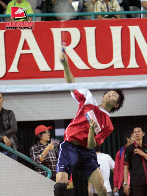 Hermansyah, pemain asal Jaya Raya Jakarta sedang memukul kok saat bertanding melawan Alamsyah dari Pertamina Indonesia di babak perempat final.