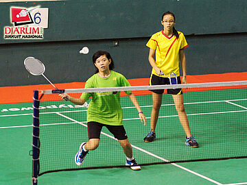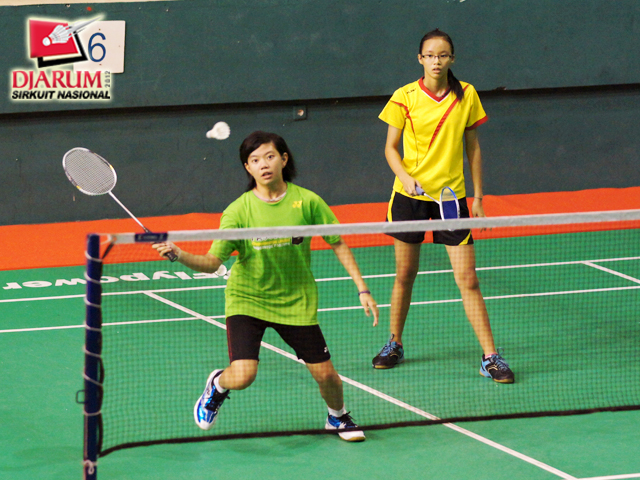 Pasangan ganda remaja putri saat berlatih di GOR Soedirman.