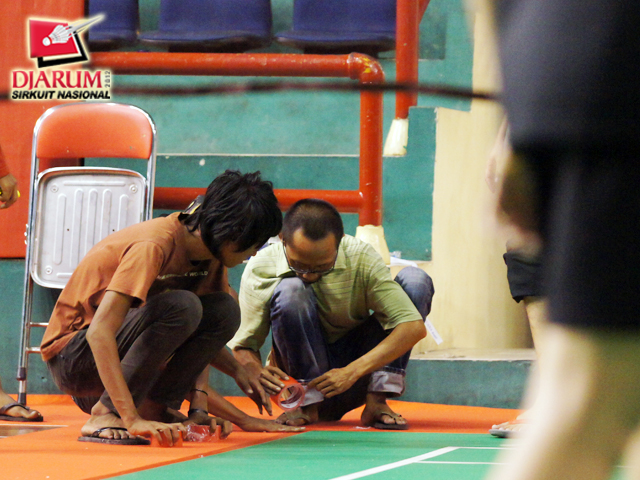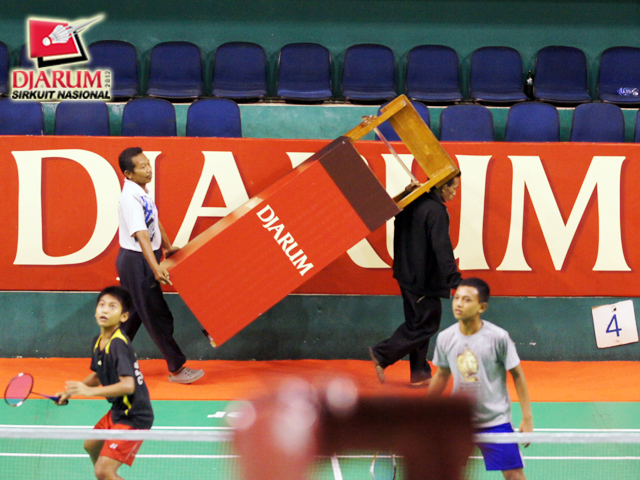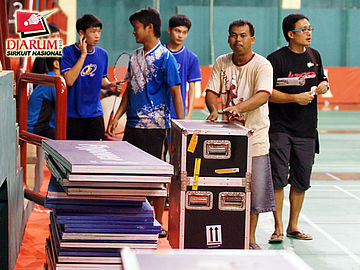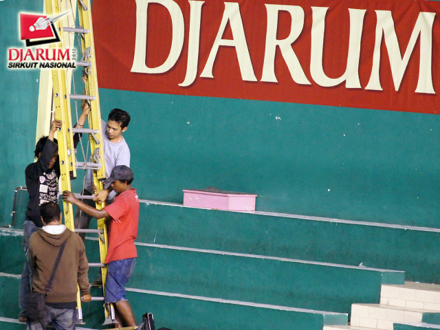Seorang pekerja saat menyiapkan perangkat properti Kejuaraan Djarum Flypower Sirkuit Nasional (Sirnas) Jatim Open 2012.
