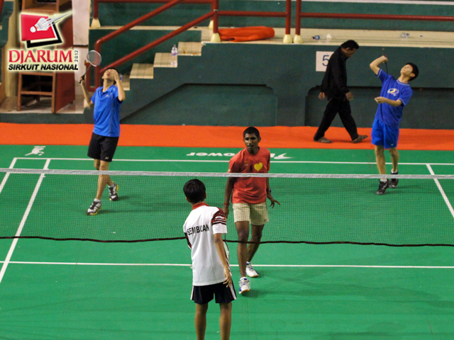 Pasangan ganda remaja putra saat berlatih di GOR Soedirman.