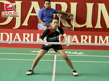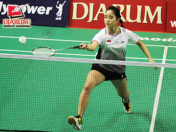 Tunggal Dewasa Putri asal PB Djarum Kudus, Rosaria Yusfin berusaha mengembalikan bola ke arah Lidya Ananta (PTP).