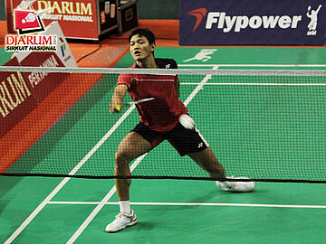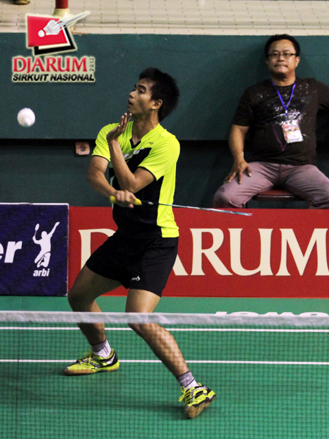 Panji Akbar (Pelatnas) langsung menyambar bola tanggung yang dilepaskan Pandu Dewantoro (PB Djarum Kudus).