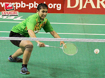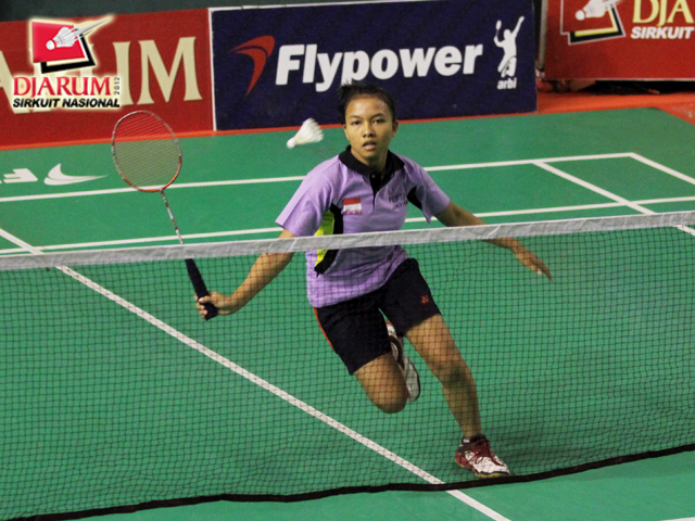 Lidya Ananta (PTP) mengejar bola smash menyilang yang diberikan Millicent Wiranto (Pelatnas).