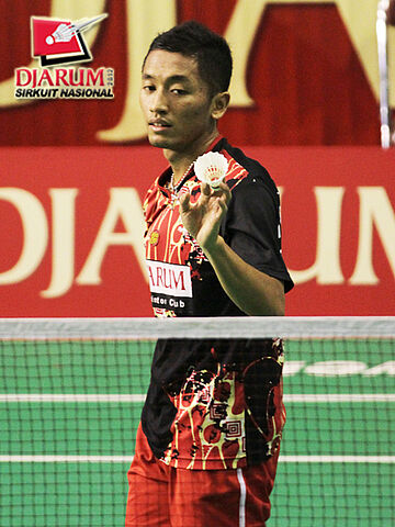 Pandu Dewantoro (PB Djarum Kudus) meminta pergantikan shuttlecock.