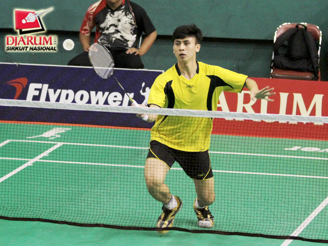 Kelvin SUnaryo (Exist) berusaha mengembalikan bola ke arah Muhammad Bagus (PB Djarum Kudus).
