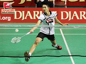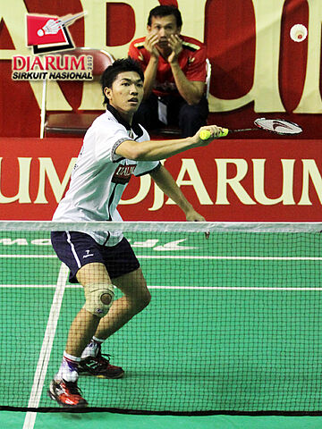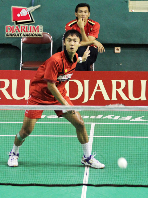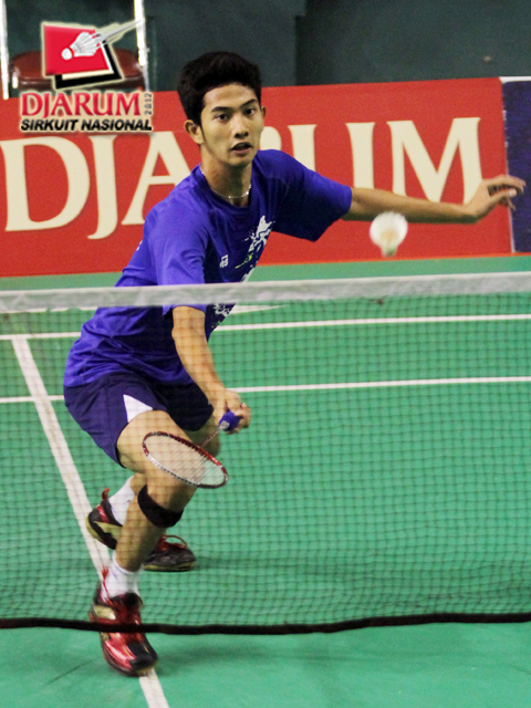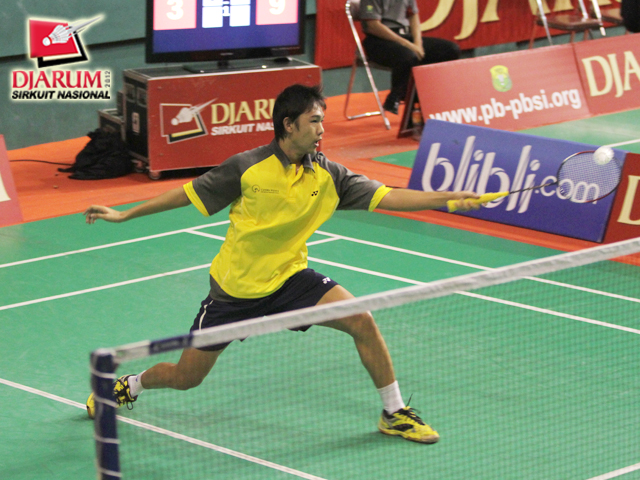 Unggulan kedua tunggal taruna putra, Ari Januari (Tangkas Specs) berhasil menggapai bola drop shoot yang diberikan Wilson (Candra Wijaya).