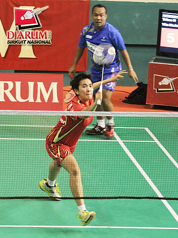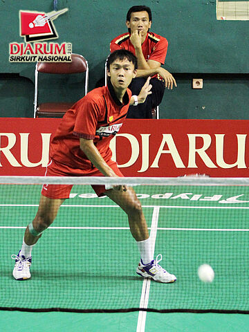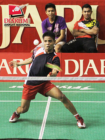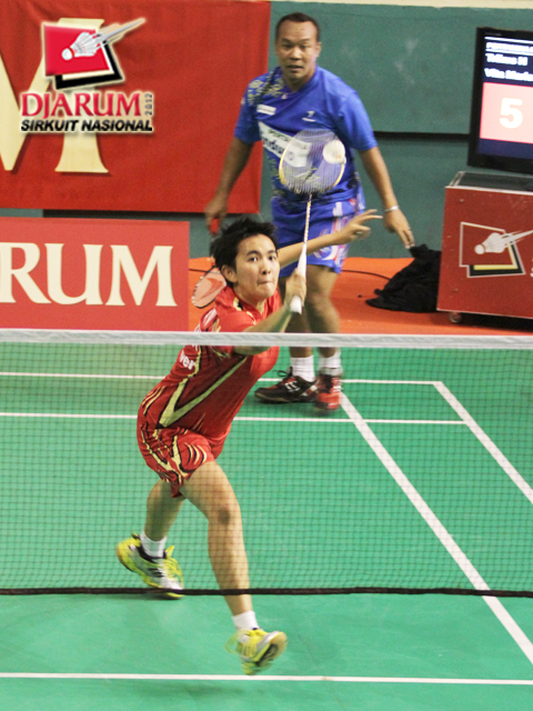 Wilson (Candra Wijaya) menyambut serve dari Ari Januari (Tangkas Specs).