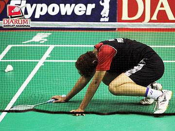 Ekspresi Fajar Wikajaya (Pelita Bakrie) setelah kalah dari Rudi Cahyadi (PB Djarum Kudus).