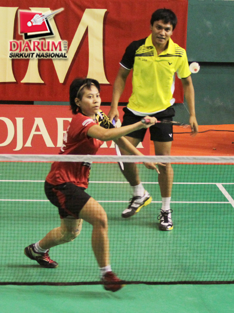 Pasangan ganda campuran dewasa, Andro Septian/Yayu Rahayu (Pusdiklat Pikiran Rakyat/PB Djarum Kudus) menyambar bola tanggung yang diberikan Trikus Harjanto/Vita Marissa (Pertamina Indonesia/Tangkas Specs).