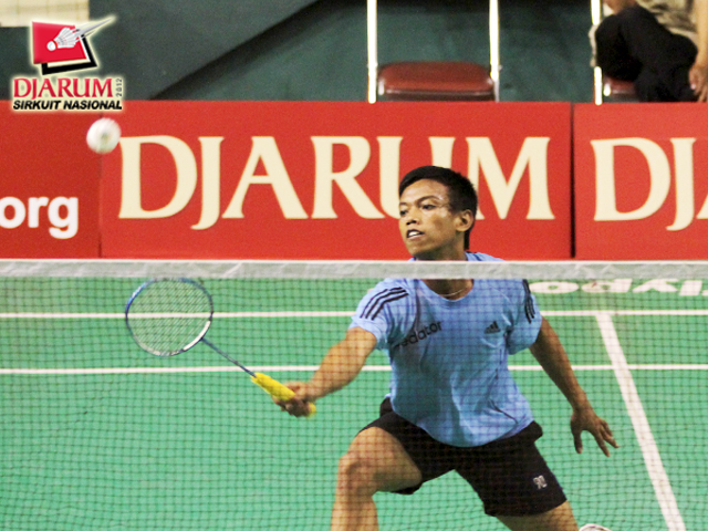 Rudi Cahyadi (PB Djarum Kudus) melepaskan drop smash ke arah Fajar Wikajaya (Pelita Bakrie).