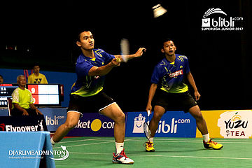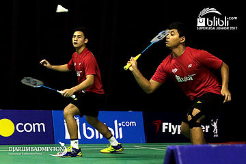 Helmi Yudha Arrafi/Peter Mandala Surya Sumardi (Mutiara Cardinal) Mengembalikan Shuttlecock