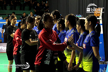 Tim U-19 Putri Djarum (Kiri) Bersalaman Dengan Tim U-19 Putri Mutiara Cardinal
