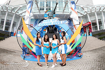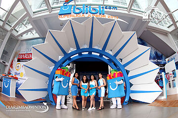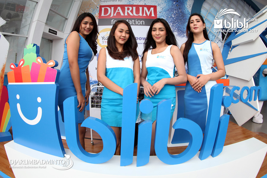 Empat Usher Cantik Dan Dua Maskot Blibli.com Superliga Junior 2017 Berpose Di Depan Pintu Masuk GOR Djarum