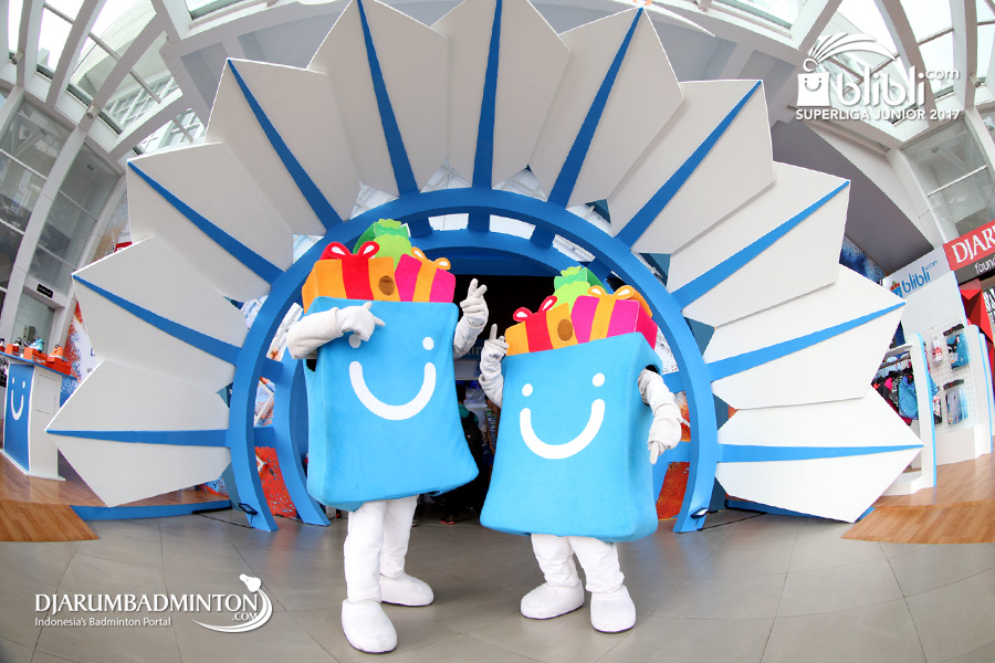 Dua Maskot Blibli.com Superliga Junior 2017 Berpose Di Depan Pintu Masuk GOR Djarum