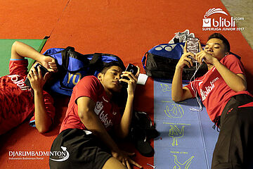 (Dari Kiri) Rehan, Handoko Dan Leo Sedang Bersantai Memainkan Gadget Selagi Menunggu Laga Final Tim Putra U-19 Blibli.com Superliga Junior 2017
