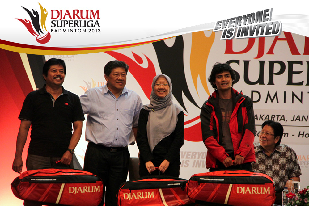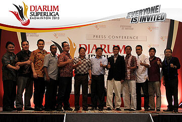 Segenap Perwakilan Klub Peserta Djarum Superliga Badminton 2013 Berpose Bersama Direktur PT. Djarum Yan Haryadi, Direktur Superliga Yoppy Rosimin, dan Kabid Pengembangan PB. PBSI , Basri Yusuf